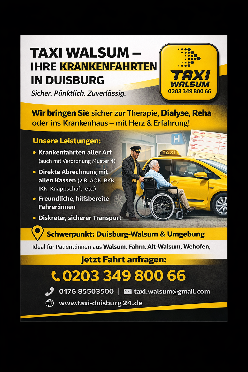 Ruhige, diskrete Fahrt – auf Wunsch kurze Info bei Ankunft/Abholung. Serienfahrten (z. B. Dialyse) planen wir zuverlässig im Voraus.